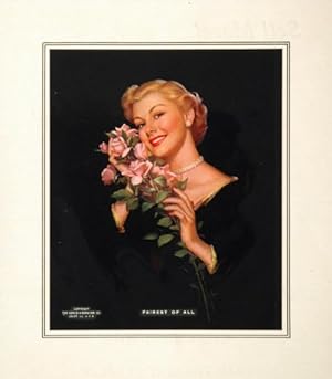 This is an original hand tipped-in print of a lovely woman in a black dress with a bouquet of pink roses. The print can be easily removed for framing.